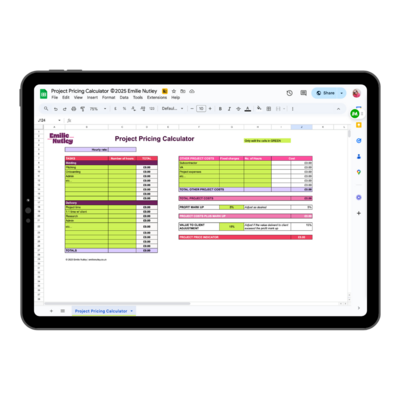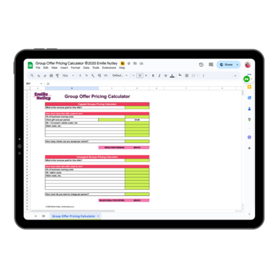 One for services, one for group offers, one for projects. Just plug in your numbers and see what your break-even and profit points actually are. No maths degree required. This is the tool you’ll come back to every time you build something new.