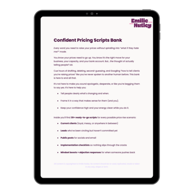 This toolkit wasn’t built to make you feel good about charging more. It was built to help you actually do it, without spiralling, stalling, or softening your worth mid-email.